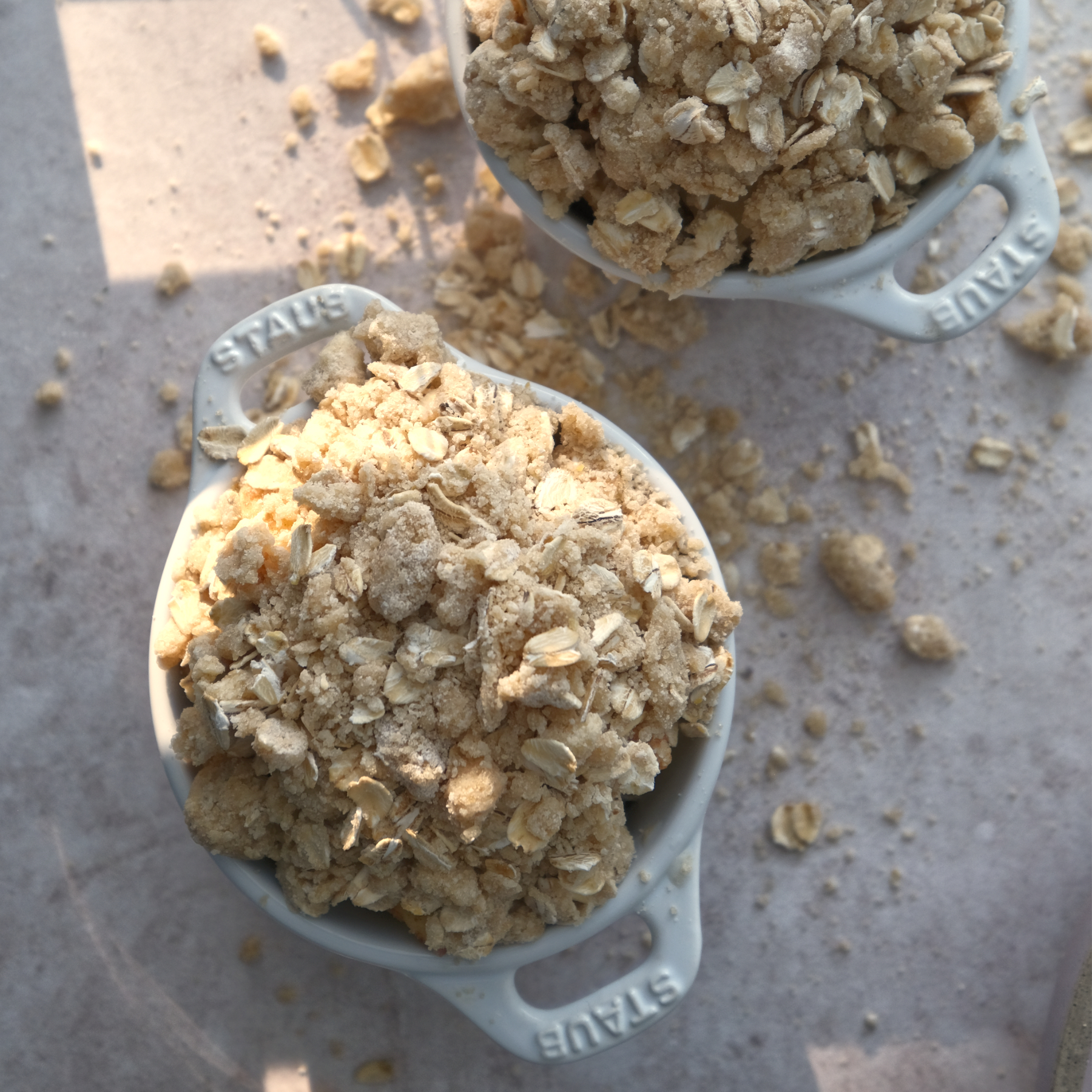 - Divide the apple mixture evenly between the ramekins. Top each apple crisp with half of the topping.