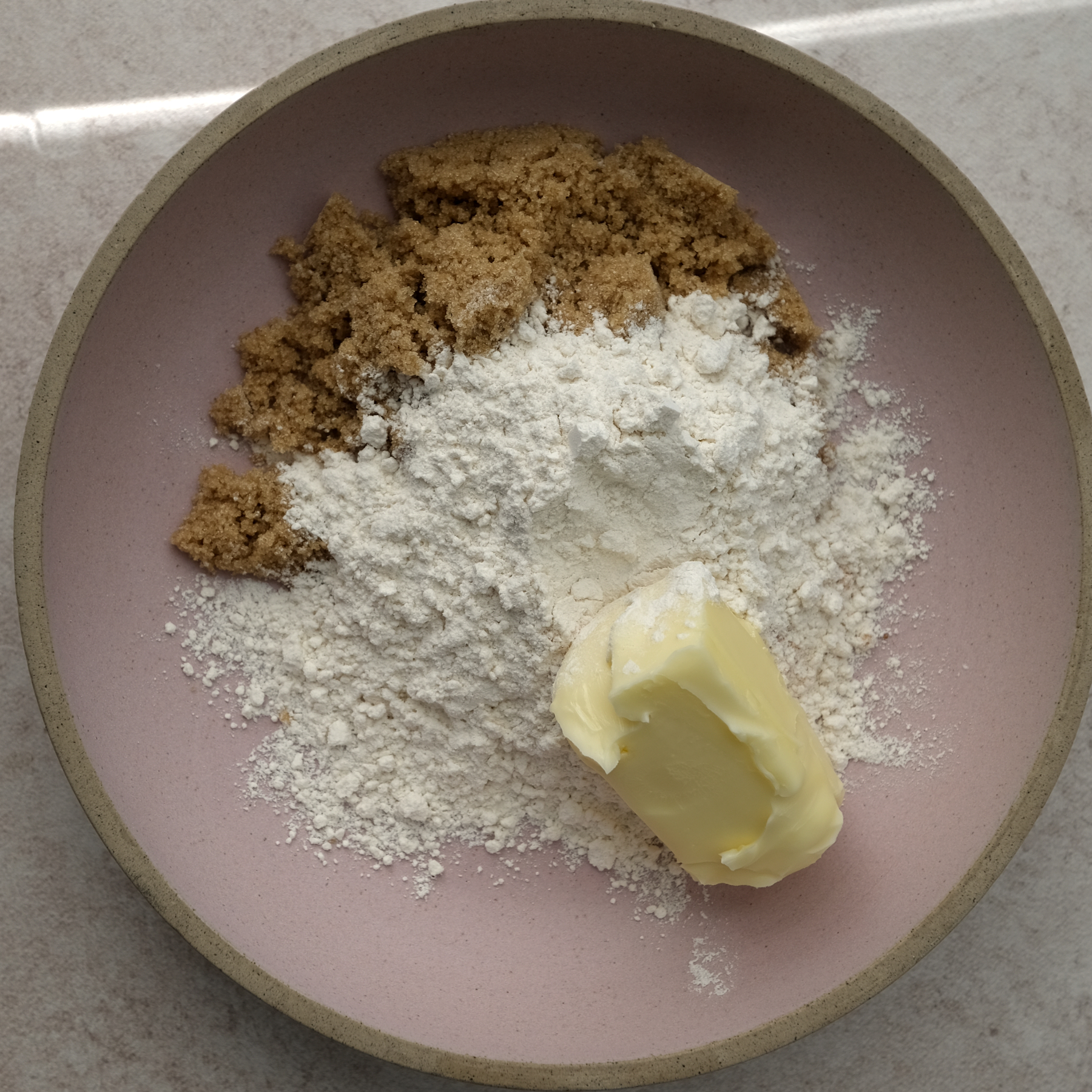 - In a medium bowl, add all the crumb topping ingredient until combined. Use your hands or a fork to mix until crumbly, with both small pieces and larger chunks. Set aside.