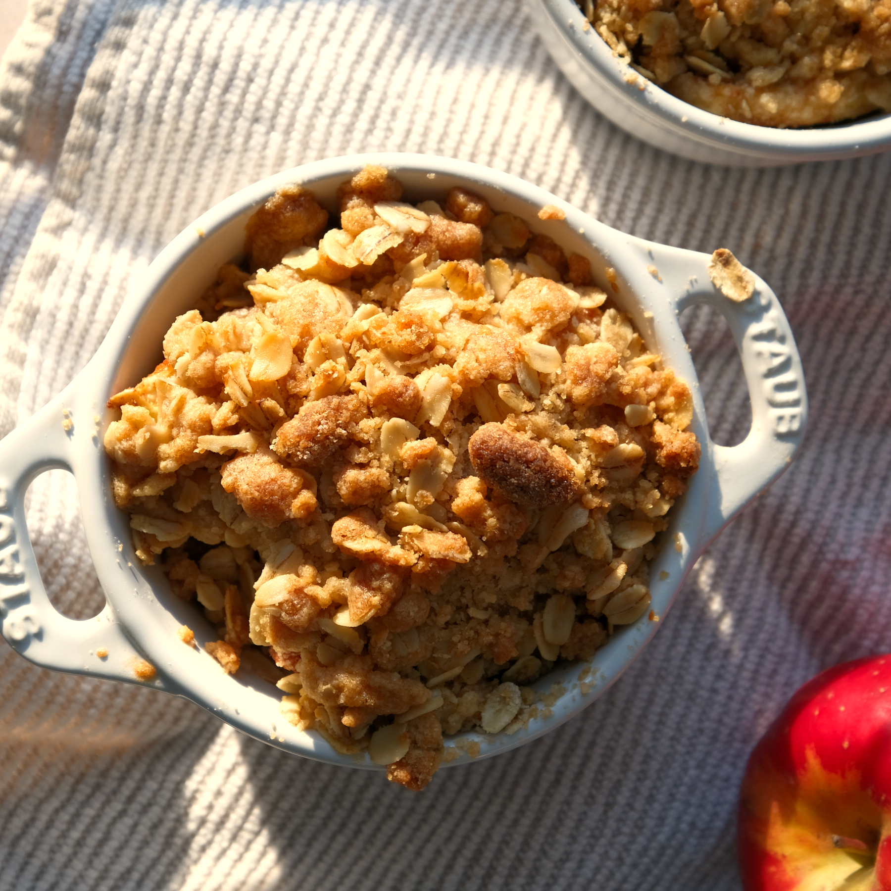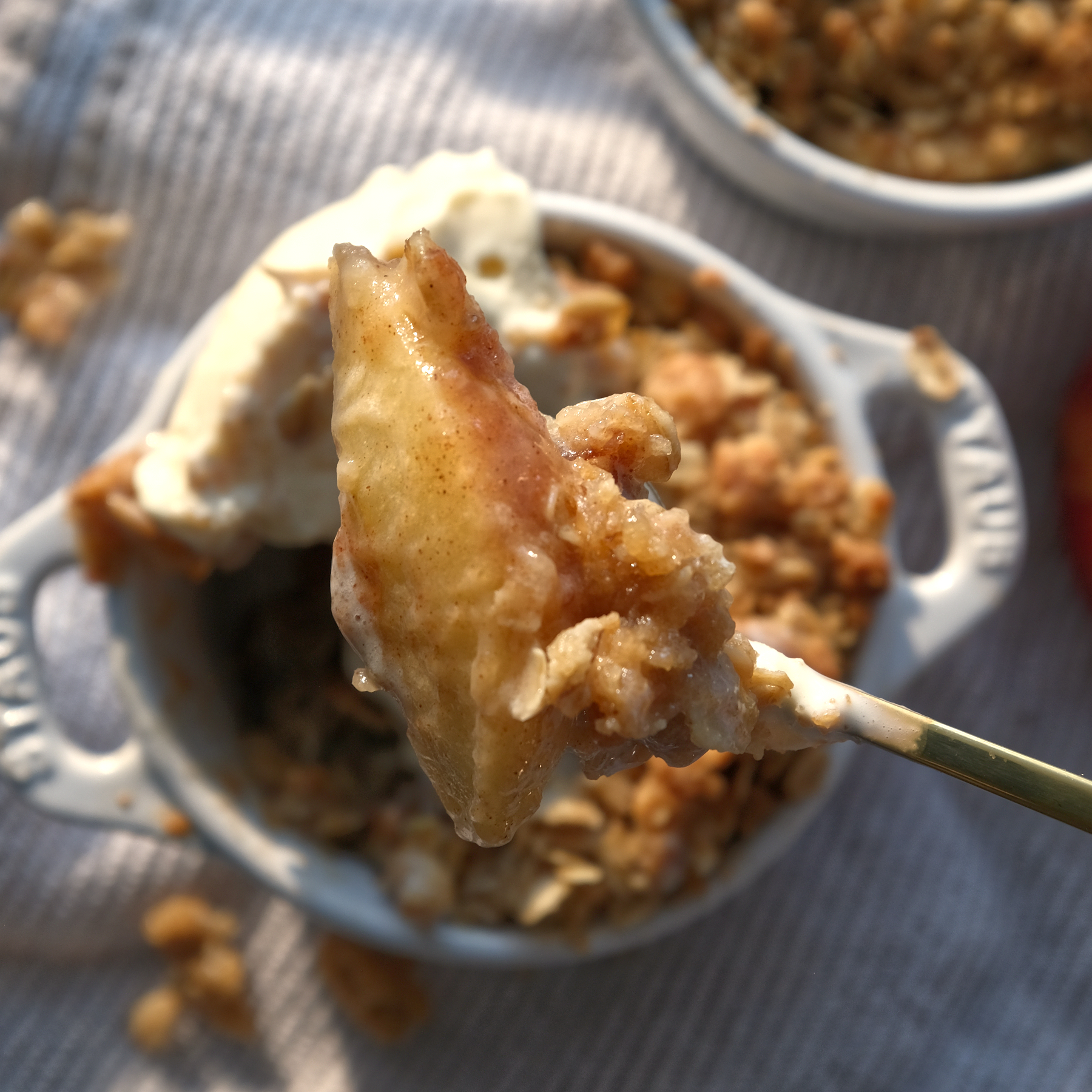 Apple crisp for two- It's easy and warm and perfect for two. This recipe uses two apples that's perfectly sweetened to pair with the best oat streusel topping that makes it not too sweet. Serve with a scoop of vanilla ice cream and it's the perfect small batch dessert this winter.