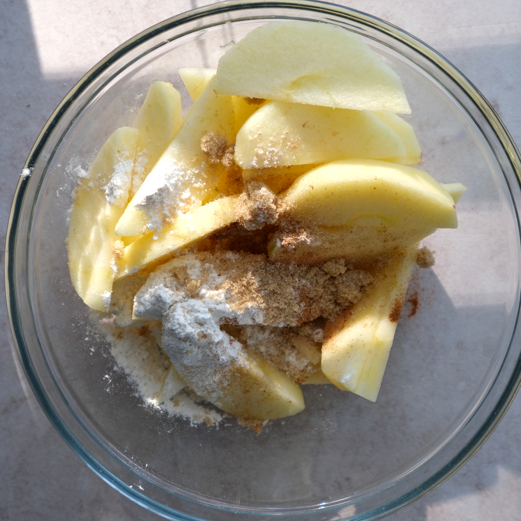 Wash, peel, and dice the apples into 1-inch pieces. Place them in a small bowl and add the brown sugar, cinnamon, and flour. Toss until evenly coated.