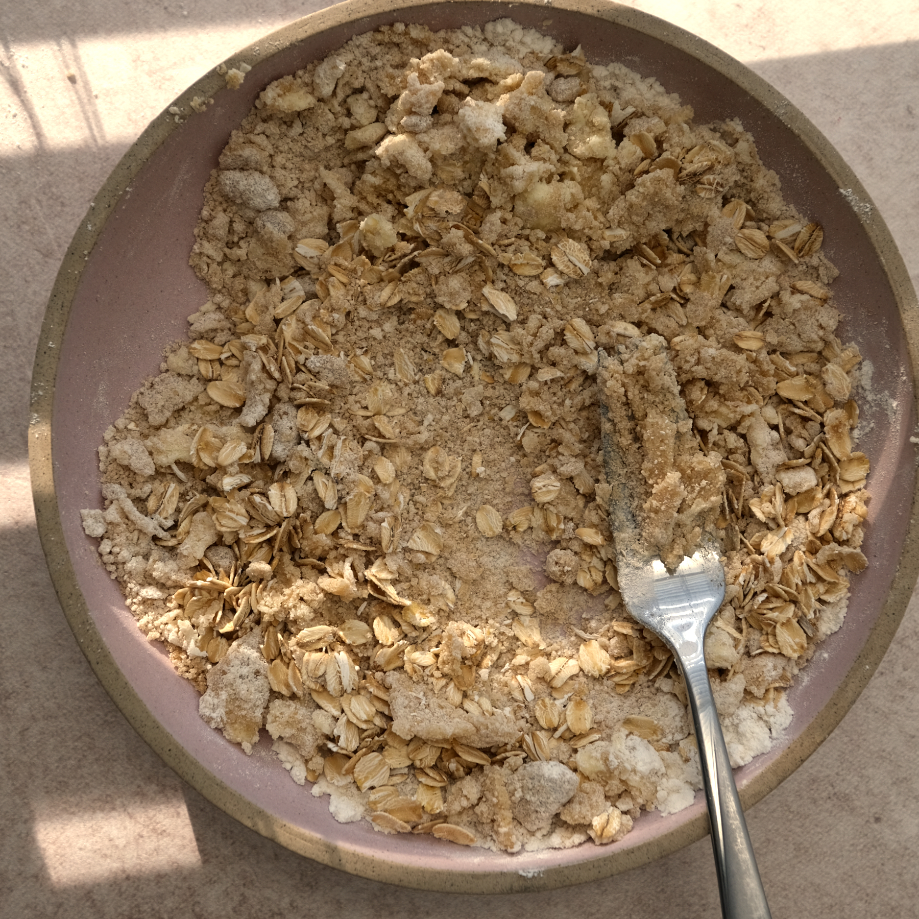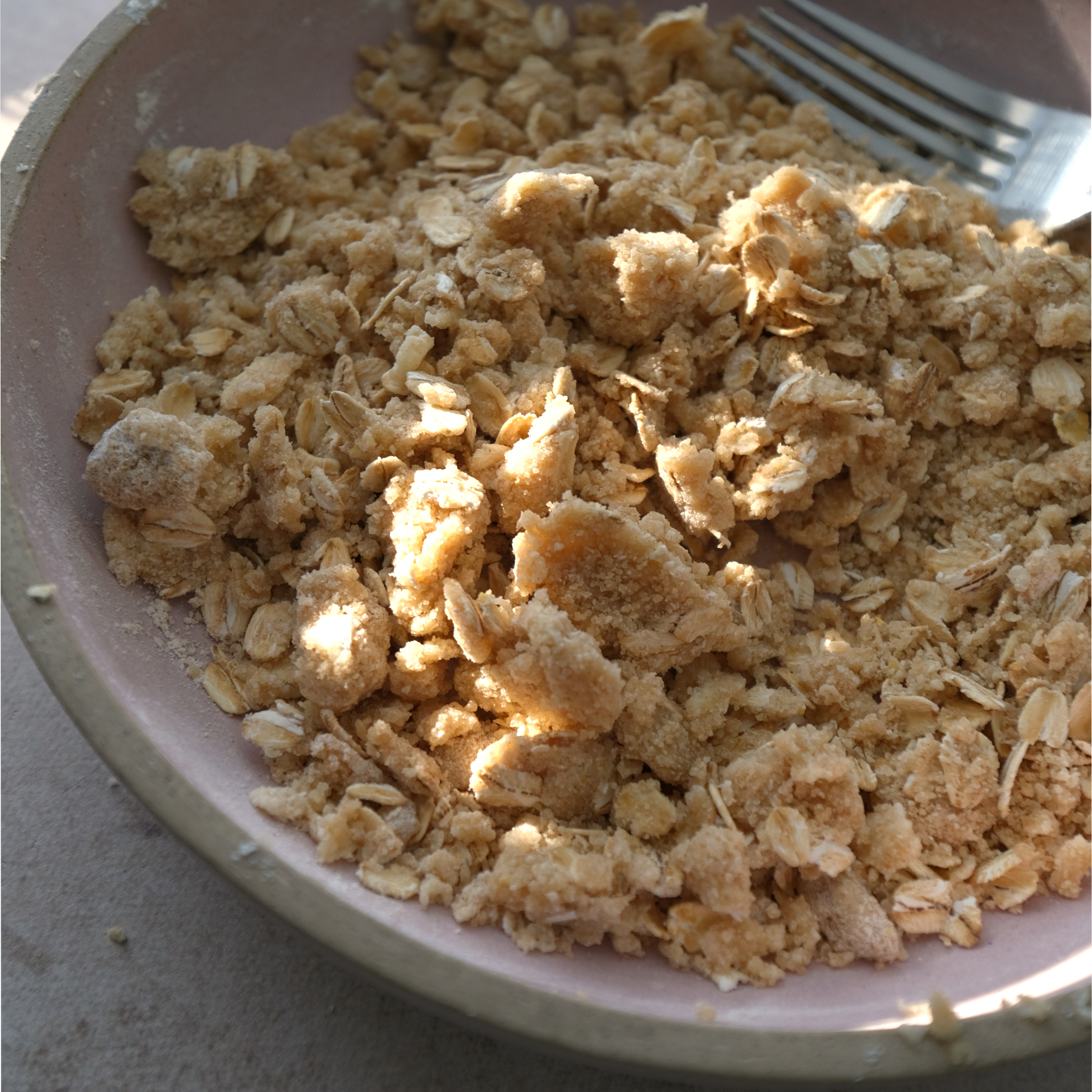 In a medium bowl, add all the topping ingredients mix to combine. Use your hands or a fork to mix until crumbly, with both small pieces and larger chunks. Set aside.